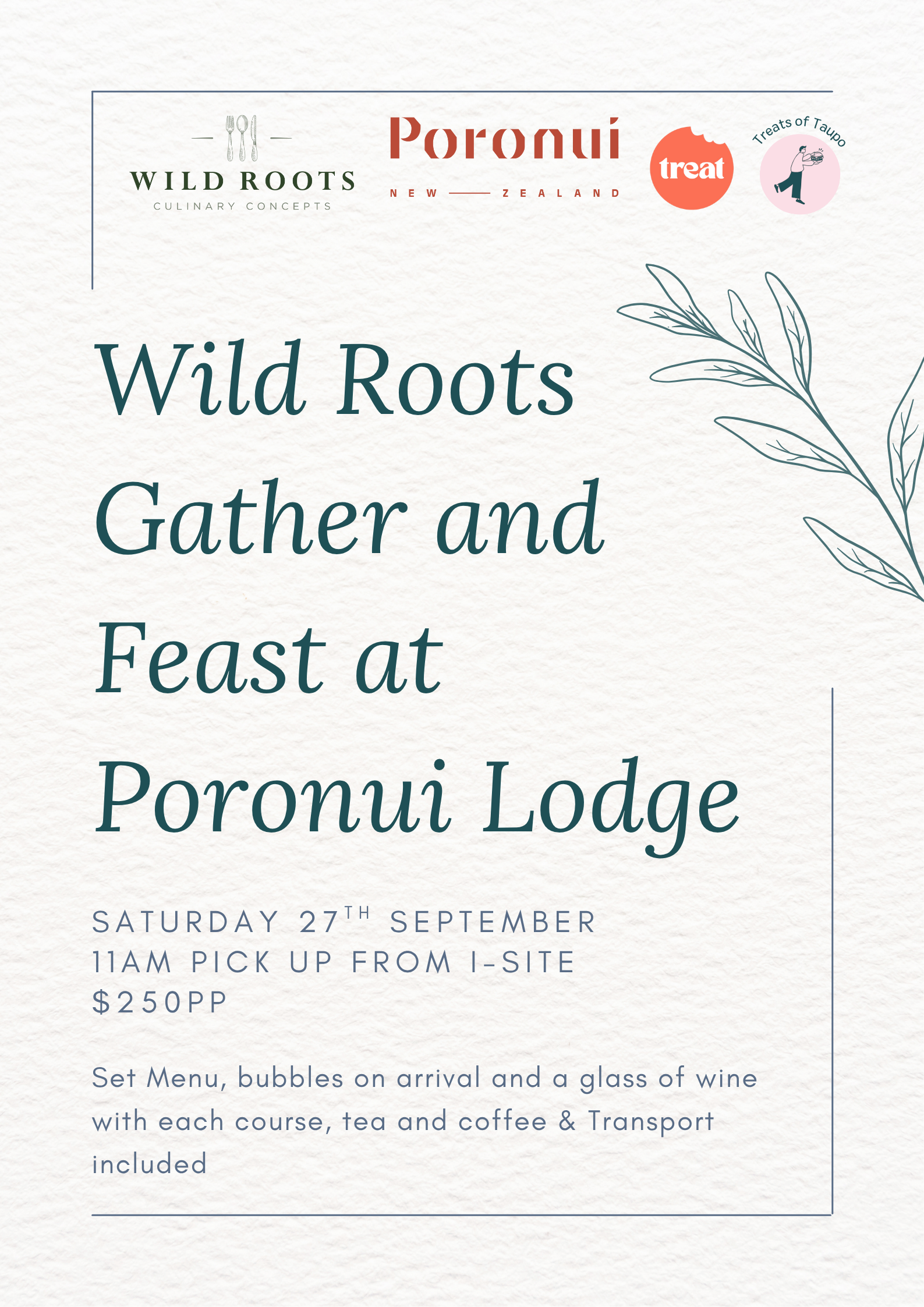 WHEN: Saturday 27th September 11am Pick Up - 3.30pm Depart Poronui
